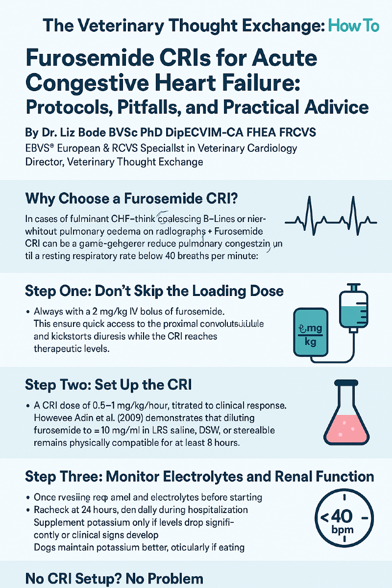 Furosemide CRIs remain a powerful tool in the management of acute CHF, particularly in the critical first 8–12 hours. With careful dosing, monitoring, and thoughtful transition to bolus and oral therapy, we can effectively stabilise patients and guide them toward a safe discharge.